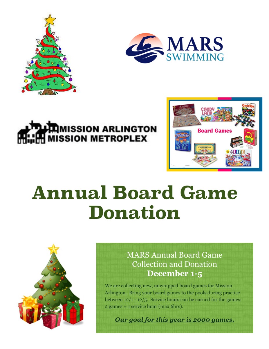 The MARS Foundation Annual Board Game Donation to Mission Arlington runs through Friday, December 5th. Donations can be brought to any of the MARS locations during practice through 12/5. This year's goal is 2000 games.